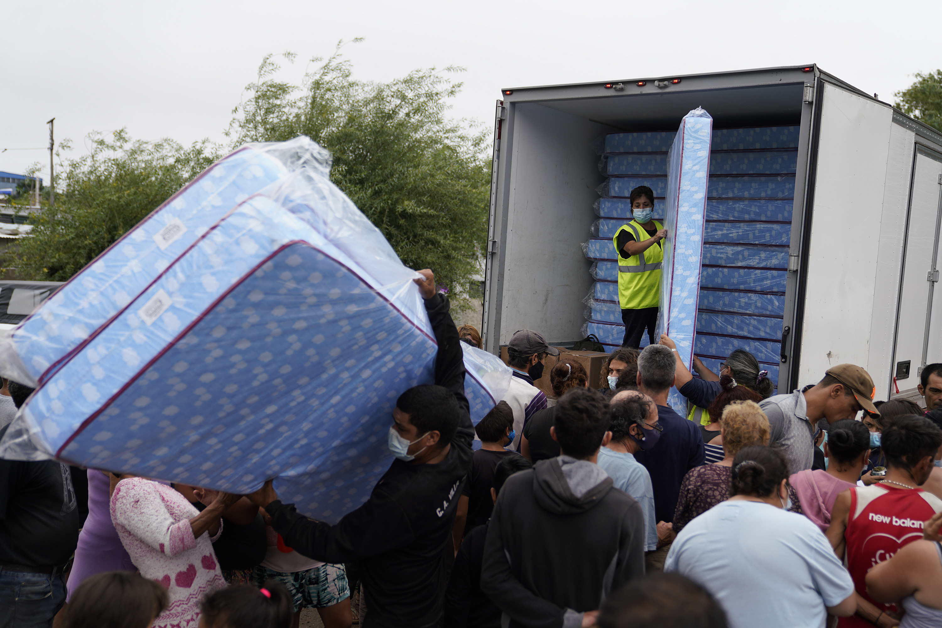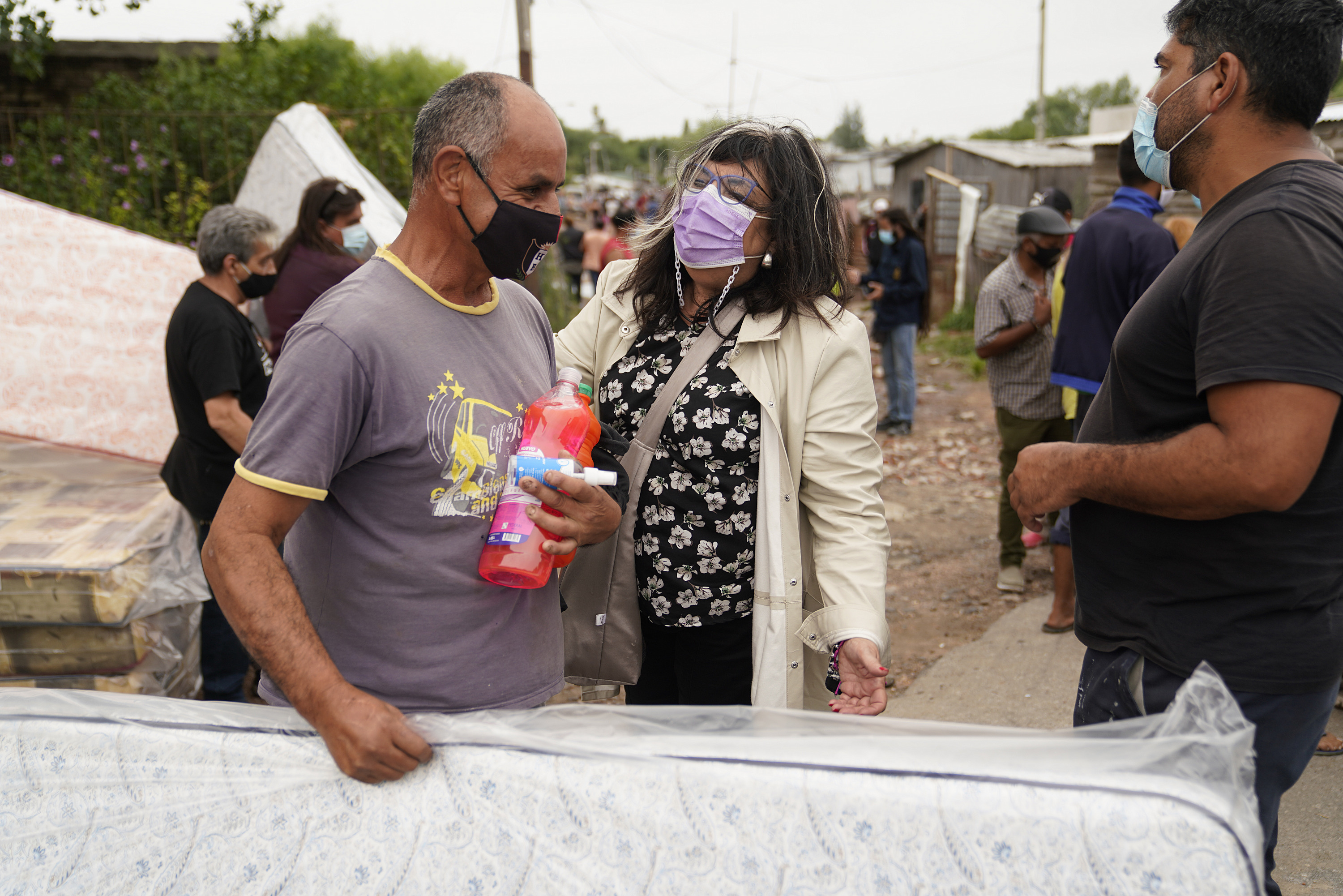 Donación de colchones y elementos de limpieza en el asentamiento Los Milagros para familias damnificadas por las inundaciones